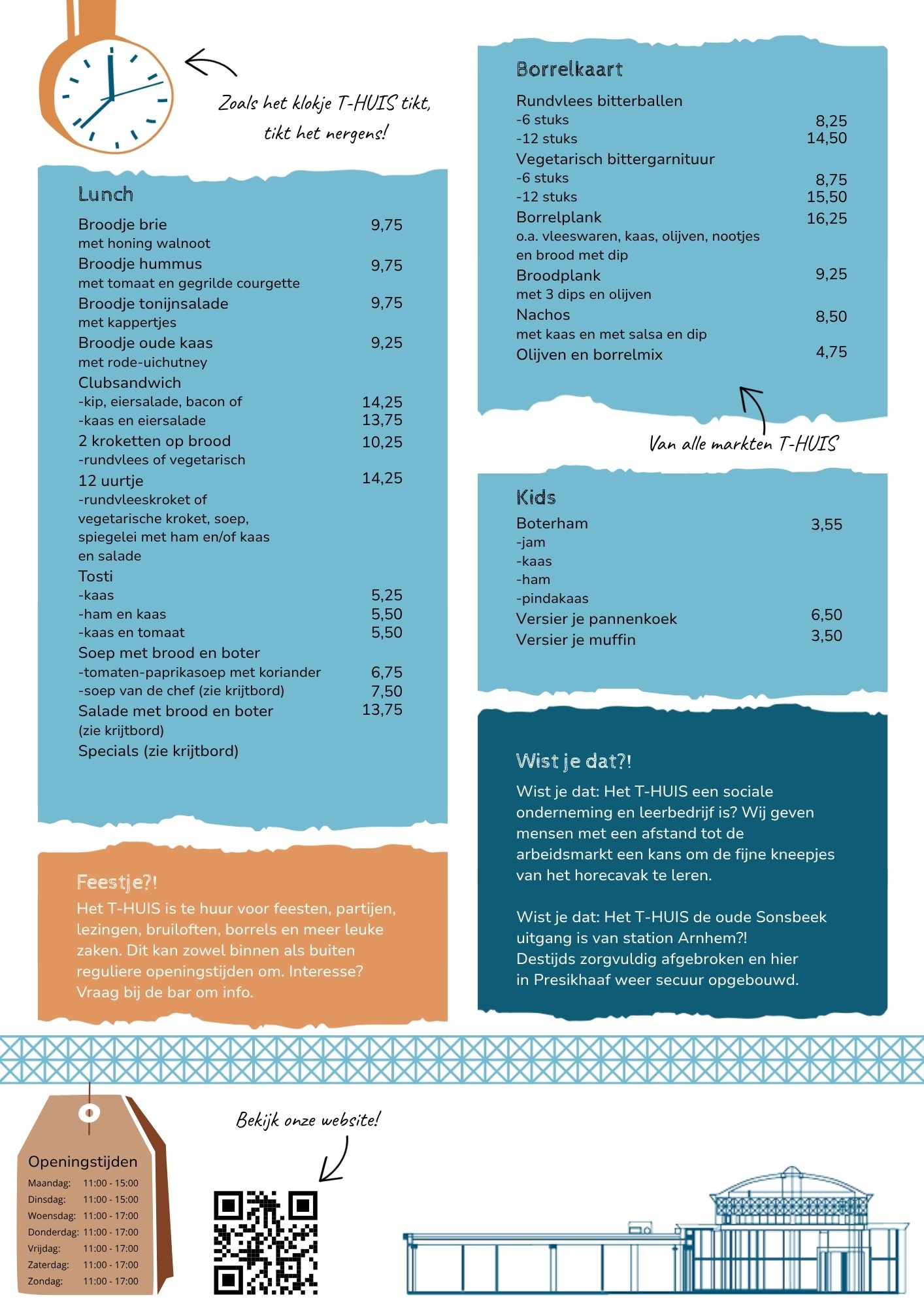 De combinatie met de Stadsboerderij maakt dat ook vele vaders, moeders, opa’s en oma’s het T-HUIS kunnen bezoeken met hun (klein)kinderen na een bezoek aan de boerderij. Zoals u kunt zien houdt de menukaart ook rekening met de jonge gasten.